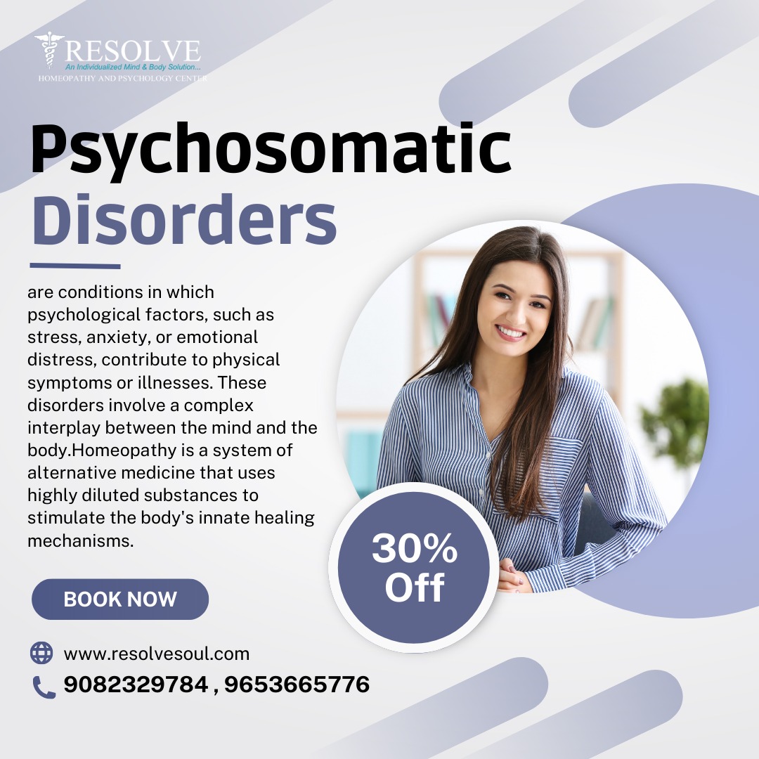 Psychosomatic disorders are a unique class of health conditions where physical symptoms are intricately linked to psychological or emotional factors. These disorders highlight the profound connection between the mind and body. At Resolve Homeopathy And Psychology Center, we understand the complexity of psychosomatic disorders and offer a holistic approach to their management. Our approach includes homeopathic medicine, counseling sessions, and tailored remedial measures aimed at addressing the underlying psychological factors. Understanding Psychosomatic Disorders: Types and Warning Signs: Psychosomatic disorders encompass a range of conditions where emotional stress, anxiety, or unresolved psychological issues manifest as physical symptoms. Common types include: Somatization Disorder: This involves multiple, recurring, and often vague physical complaints, such as pain, gastrointestinal issues, or neurological symptoms, with no identifiable medical cause. Conversion Disorder: In this condition, psychological distress is "converted" into physical symptoms, such as paralysis, blindness, or seizures, often without a neurological explanation. Illness Anxiety Disorder: Individuals with this disorder experience excessive worry and fear about having a serious medical condition, despite medical reassurance that no such condition exists. Psychogenic Pain Disorder: Chronic pain that cannot be explained by a medical condition is a hallmark of this disorder. The pain is often exacerbated by emotional stress. Common warning signs of psychosomatic disorders include: Frequent and unexplained physical symptoms or complaints. Discrepancy between the severity of symptoms and medical findings. Symptoms worsening in response to stress or emotional distress. Persistent preoccupation with physical health and fear of serious illness. Holistic Management at Resolve Homeopathy And Psychology Center: Homeopathic Medicine: Homeopathy offers individualized remedies that address both physical and emotional aspects of psychosomatic disorders. These remedies aim to restore balance within the mind and body, alleviating physical symptoms without side effects. Counseling Sessions: Our experienced psychologists and counselors provide a safe and supportive space for individuals to explore underlying emotional issues, manage stress, and develop coping strategies to break the cycle of psychosomatic symptoms. Remedial Measures: Tailored interventions may include stress reduction techniques, mindfulness practices, and lifestyle adjustments to address the psychosomatic aspects of the condition. Conclusion: Psychosomatic disorders remind us of the intricate connection between our mental and physical well-being. At Resolve Homeopathy And Psychology Center, we offer a holistic approach to managing psychosomatic disorders, combining homeopathic medicine, counseling sessions, and remedial measures to address the root causes. Our aim is to empower individuals to regain control of their health and well-being by healing the mind-body connection. If you or someone you know is struggling with a psychosomatic disorder, contact us today to embark on a journey toward healing and improved quality of life.